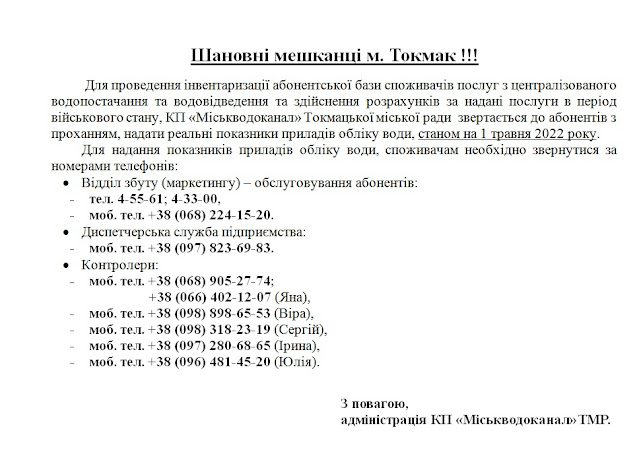 Комунальне підприємство "Міськводоканал" Токмацької міської ради